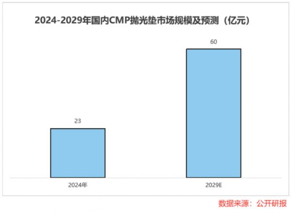 预计2024到2029年,国内CMP抛光垫市场规模将从23亿元飙升到60亿元,年复合增长率超20%。
