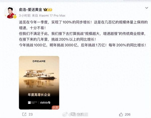 当然,俞浩或许有自己的考量。万亿目标未必是真的觉得后年就能到,更多的是一种对团队、对市场的“信号发射”——告诉所有人,追觅的野心不止于此,追觅要干大的。但如果这个信号发射得太猛,变成了对资本市场的过度承诺,那最终的代价可能远远超出俞浩的想象。