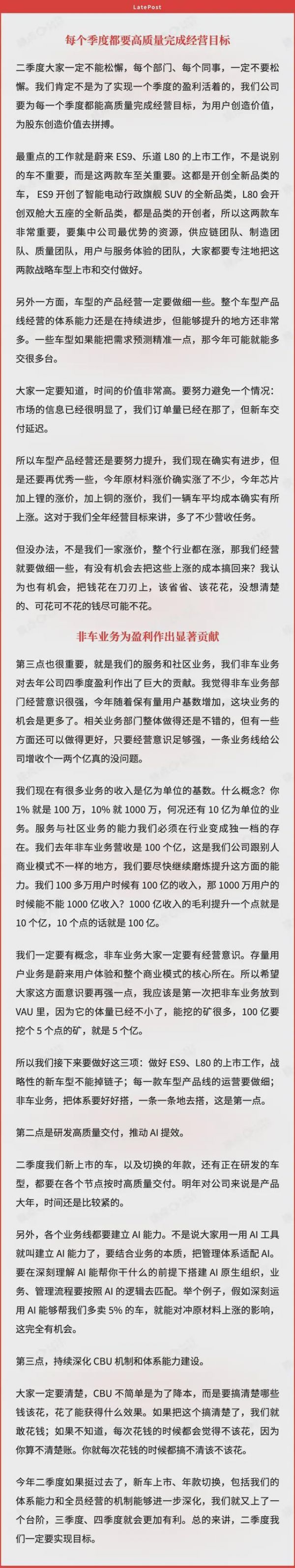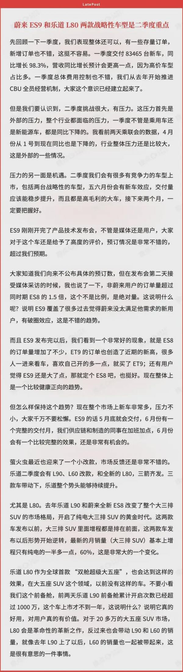 除蔚来 ES9 外,大五座 SUV 乐道 L80 也将于二季度发布。今年 1 月乐道品牌单月交付 3481 辆,同比下降 41%、环比下降 62%,为品牌推出以来月度新低,3 月回升至 6877 辆。L80 的登场将是拉回销量曲线的关键。李斌也把 ES9 与 L80 的销量表现视为二季度业绩的关键胜负手,“这两款车非常重要,要集中公司最优势的资源,二季度我们一定要实现目标。” 他同时提出,蔚来要努力避免新车上市后交付跟不上订单的情况。