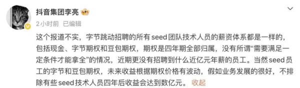 对此,抖音集团副总裁李亮公开回应称,近期没有招聘到什么近亿元年薪的员工,Seed 团队所有技术人员薪资体系统一,由现金、字节期权与豆包期权构成,期权是四年期全部归属,不存在「需要满足一定条件才能拿全」的情况。他同时坦言,若业务发展顺利,部分技术人员四年后的期权收益确有可能达到数亿元量级。