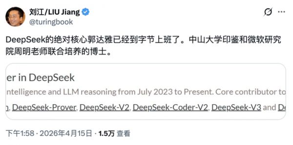 曾参与 DeepSeekMath、DeepSeek-V3、DeepSeek-R1 等多个重磅项目的 95 后研究员郭达雅,则近期转投字节跳动旗下 Seed 团队,担任 Agent 负责人之一,职级为 L8。
