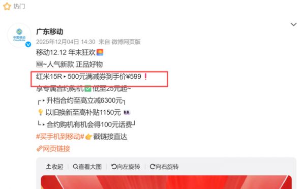比如如下图所示,只需要办理25块钱的月套餐,就可以以599元的价格买到红米15R。