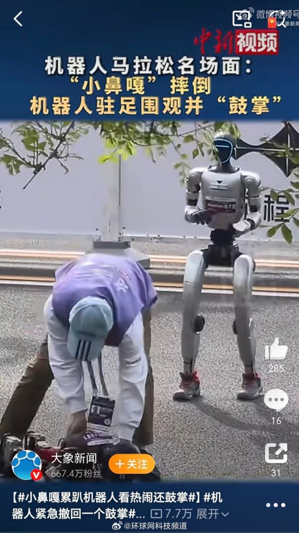 【#小鼻嘎累趴机器人看热闹还鼓掌#】2026人形机器人半马赛场,一“小鼻嘎”机器人“累趴”倒在地上,路过机器人停下看热闹还鼓掌。(中国新闻社)