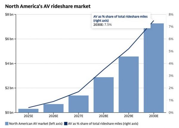 这 4,400 亿美元由无数具体行业的收入构成。首当其冲的是出租车、专车、班车及货运卡车司机的工资;其次是 Uber 等网约车平台分配给司机的订单收入。如果人类作为驾驶者的价值被 AI 取代,依附于此的收益分配机制将彻底改变。Delaney 直接点名了网约车行业:“基准预测显示,到 2030 年,自动驾驶将占据美加网约车总订单的 5%;悲观情景下,这一比例将升至 16%。”
