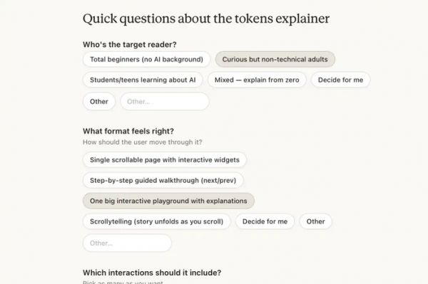 ▲Claude Design操作界面(图源:Anthropic)PCWorld记者采用了最简单的方式,什么都不上传,直接输入一句提示词:为普通用户创建一个解释AI Tokens概念的交互图表。