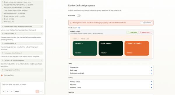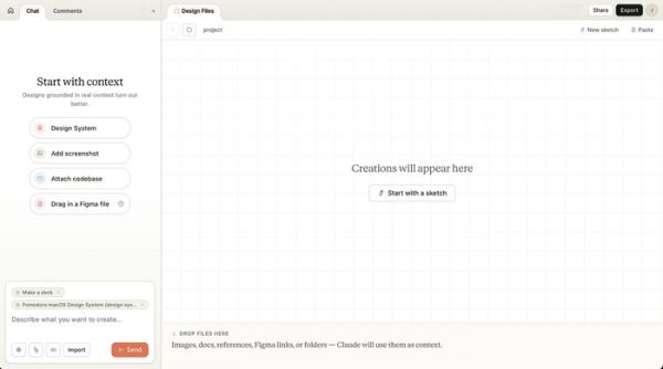 用户试用Claude Design时,界面会显示带标签的聊天框,用户可在此输入初始提示词,并选择新建原型或演示文稿,也可以从模板开始或自行创建模板,然后开启设计任务。用户还可以填写公司名称、关联GitHub仓库、绑定本地文件夹,或是上传字体、Logo等设计素材,为后续创作准备个性化资源。
