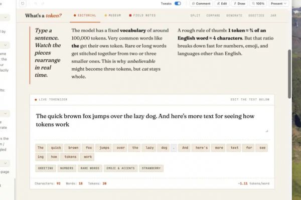 ▲Claude Design生成的AI Tokens科普网页中,可查看Token拆分效果的交互式演示模块(图源:PCWorld)