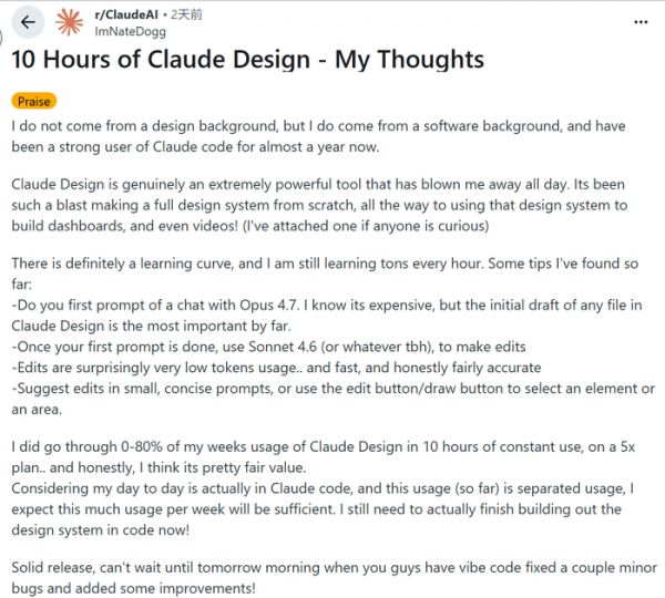 Reddit社区里,有经验的用户给出了更务实的Claude Design用法建议。4月18日,一名深度使用Claude Code近一年、有软件开发背景的用户分享了自己连续使用Claude Design十小时的体验,并总结了几条节省配额的心得: