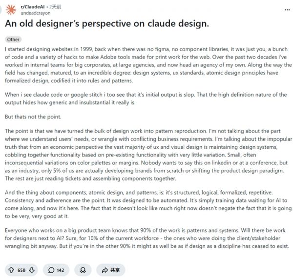 ▲Reddit用户分享的Claude Design使用体验帖(图源:Reddit)另一位有二十多年从业经验的设计师在Reddit上写道,当前不少人评价AI设计工具时,都只盯着“初期生成效果粗糙”这一点,其实完全抓错了重点。他认为,在过去十多年里,设计行业已经高度体系化,大量工作都围绕设计系统、组件复用和现有规范展开,本质上只是对已有模式的重复拼接。