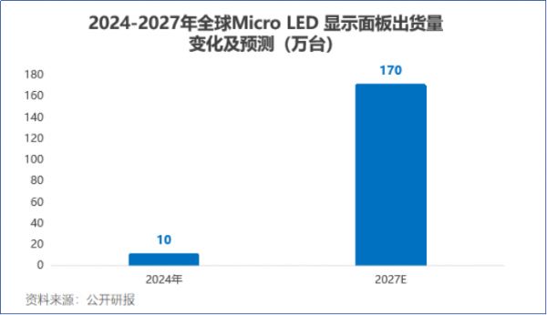 数据显示,2024年全球Micro LED显示面板出货量不过10万台,预计2027年增至170万台,2031年有望激增至3460万台。
