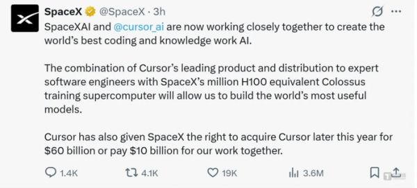 而就在今日,SpaceX 突然宣布获得以 600 亿美元收购 Cursor 的权利,或斥资 100 亿美元展开深度合作,瞬间让这笔融资再生变数。