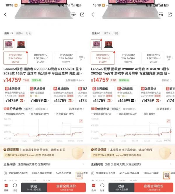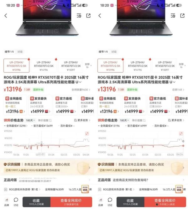 某比价App显示,多款热门笔记本型号价格波动显著。2025款拯救者R9000P AI元启RTX5070Ti 16G+1T型号,4月24日官方最低售价为17499元,而1月1日同款官方最低价格为13699元,涨价3800元;2025款玩家国度ROG枪神9 RTX5070Ti显卡16G+1T型号,1月1日官方最低为13699元,4月24日已涨至14999元,涨价1300元,涨幅显著。