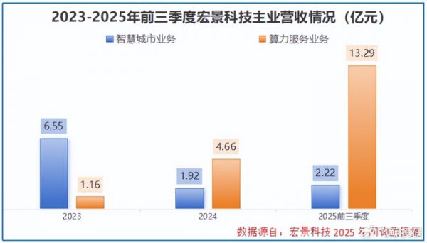 2023年,宏景科技的算力服务营收才刚过1亿元;可到了2025年前三季度,这一规模直接飙升到13.29亿元,占总营收的比例高达85.68%,实现了主业的切换。