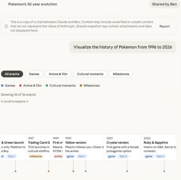 另一个测试是让它做宝可梦系列的视觉历史,带有游戏、影视、文化事件的分类筛选器,完成度相当高。