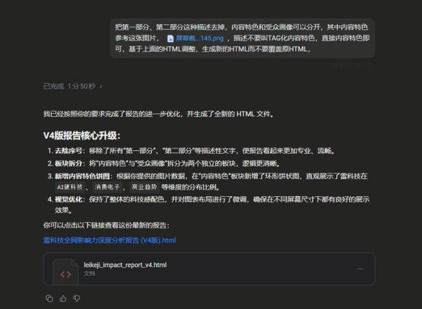 (图源:雷科技)这次更新耗时同样不到两分钟,悟空生成了V4版报告。