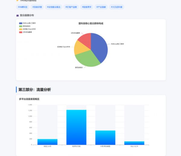 从初步呈现来看,基础框架都有了:粉丝规模、内容特色、流量分布等要点列得整整齐齐,甚至还自带了柱状图和饼图的占位。
