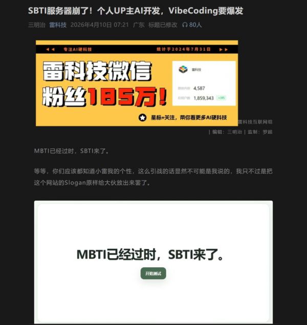 (图源:雷科技)在最后的审核中,我发现代表作展示板块里,有一篇关于SBTI的热点报道文章(正好是小雷本人写的,仅仅是在微信公众号的阅读量就有50万+)跳转链接放错了。