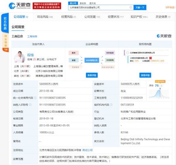 天眼查数据显示,北京嘀嘀无限科技发展有限公司成立于2013年5月,注册资本56亿人民币,法定代表人为程维,公司经营范围包括计算机软件及网络技术的研发;技术服务、技术咨询、技术转让;销售自行研发的软件产品;经济信息咨询等。天眼查股东信息显示,该公司为小桔科技香港有限公司的全资子公司。
