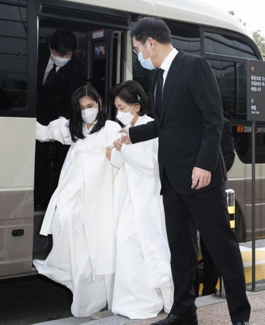 葬礼上身穿丧服的长女李富真(左二) / 网络