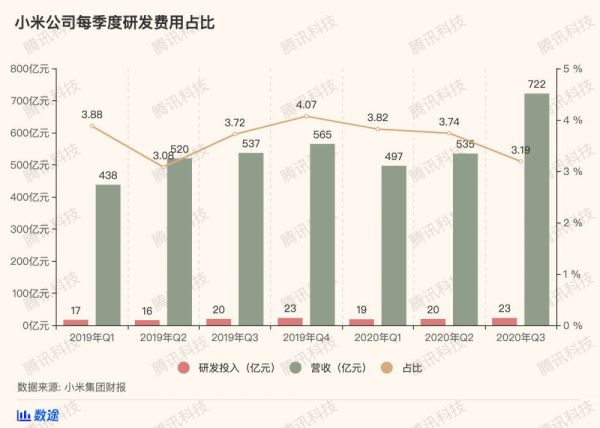 在过去的三个季度中,小米投入的研发费用总和为62亿元,整体的研发占总收入的比例基本上在3-4%之间。