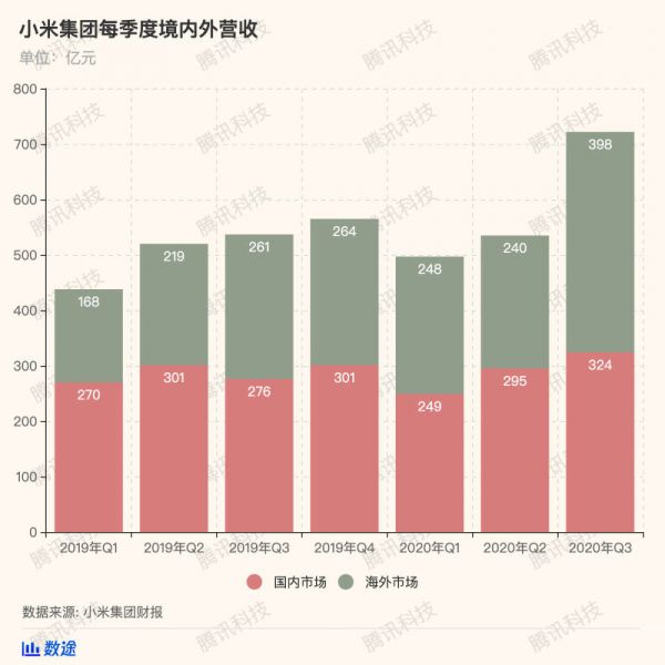 在2020年第三季度,小米集团的海外市场营收达到398亿元,国内市场营收324亿元,尽管国内营收部分保持了平稳的增长,但是海外市场小米爆发式的增长,让这一季的财报首次出现了“小米海外市场收入超过国内市场收入”的情况。之前两者最接近的一次出现在今年的第一季度,但也只是50%对50%。