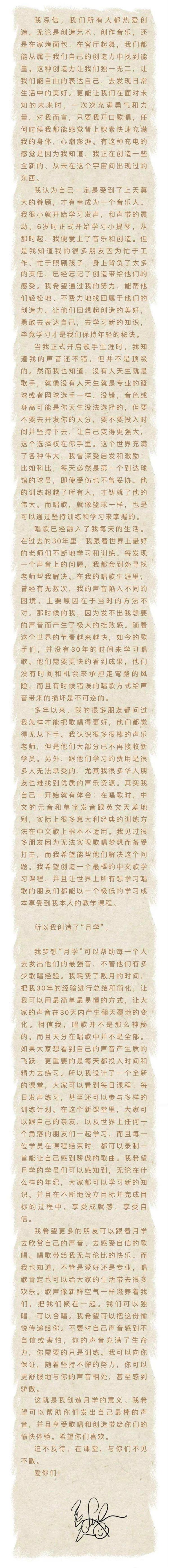 1月15日,微信公众号「月学YUEXUE」发布了“来自王力宏老师的一封信”,正式向公众介绍了将由王力宏全程讲授的唱歌技巧课程「月学YUEXUE」。