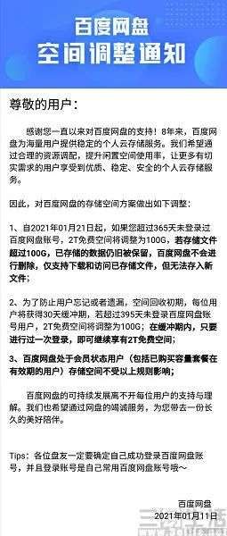 许多朋友想必都或多或少都使用过网盘这一存储工具,将自己的相关文件存储和备份到云端,但久而久之,有些人可能存着存着就忘记了。这不,日前为了唤醒休眠用户,百度网盘近期宣布将从2021年1月21日起,如果用户超过365天没有登录账号的行为,会把此前承诺的免费空间从2T大幅降低至100G。
