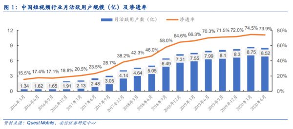 从QuestMoblie对于我国短视频行业的数据我们能够发现,从2016年4G技术大规模普及开始,中国短视频行业月活跃用户数逐年增高,到2020年6月,我国短视频行业月活跃用户数达到8.52亿,渗透率达到73.9%。