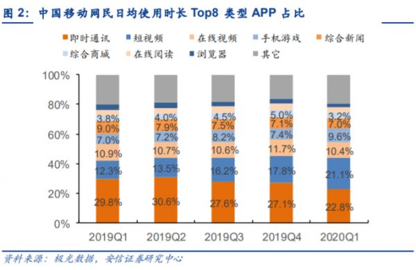 而在中国移动网民日均使用时长Top8类型APP占比中,我们发现短视频、在线视频合集使用占比在2020年第一季度已经达到31.5%,超过占比22.8%的即时通讯。