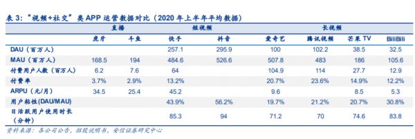 在安信证券发布的一项“视频+社交”类APP在2020年上半年的平均数据对比中,我们发现,爱奇艺、腾讯视频的DAU都在1亿上下,而B站则仅有3200万左右。相应的短视频的DAU快手则达到2.571亿,抖音达到2.959亿。
