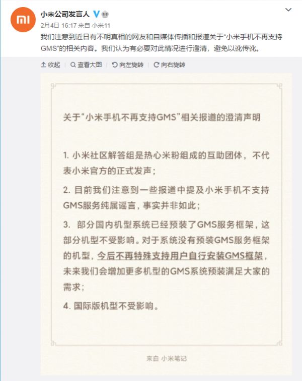 2月4日,小米公司发言人在微博上发表声明:我们注意到近日有不明真相的网友和自媒体传播和报道关于 “小米手机不再支持 GMS”的相关内容。我们认为有必要对此情况进行澄清,避免以讹传讹。部分已经安装了GMS服务的机型不会受影响,之后也会为未预装GMS的机型提供相应解决方案,国际版机型不受影响。