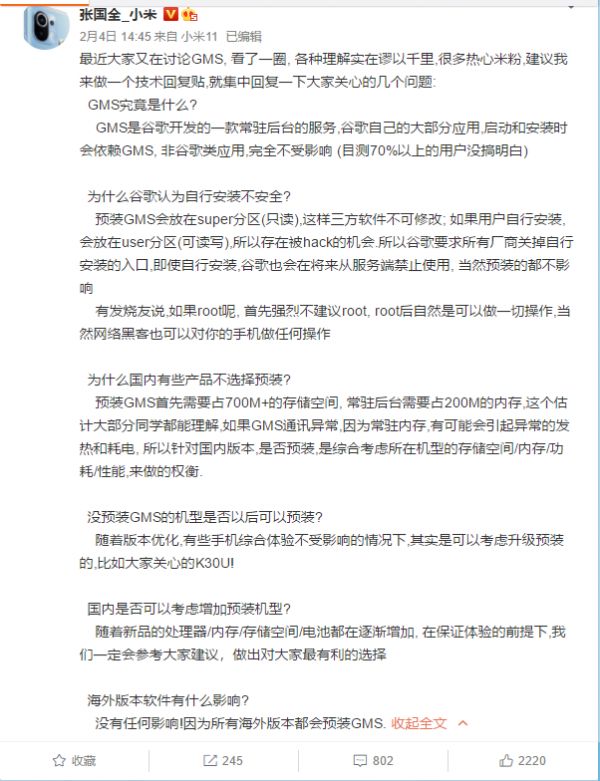 对于一些仍不是很了解原因的用户,小米系统软件总监张国全在微博上重点解释了为什么有些手机不适合预装GMS。