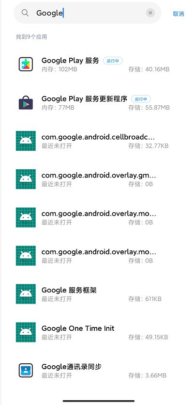 顺带一提,想要查询自己的手机是否有预装GMS服务,只需在手机应用管理页面搜索Google即可。