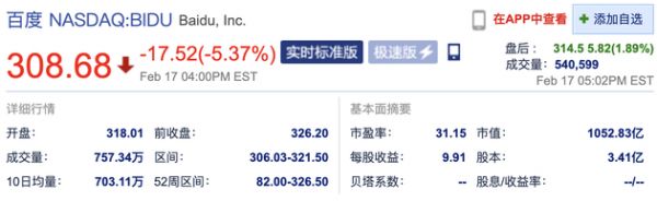 新浪科技讯 2月18日凌晨消息,百度周三收盘跌5.37%报308.68美元,市值1052.83亿美元。截止北京时间06:05,百度盘后涨2.21%报315.5美元。