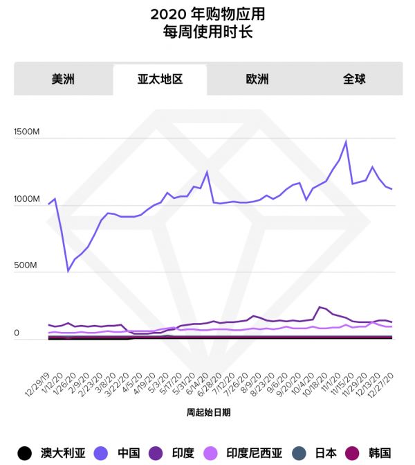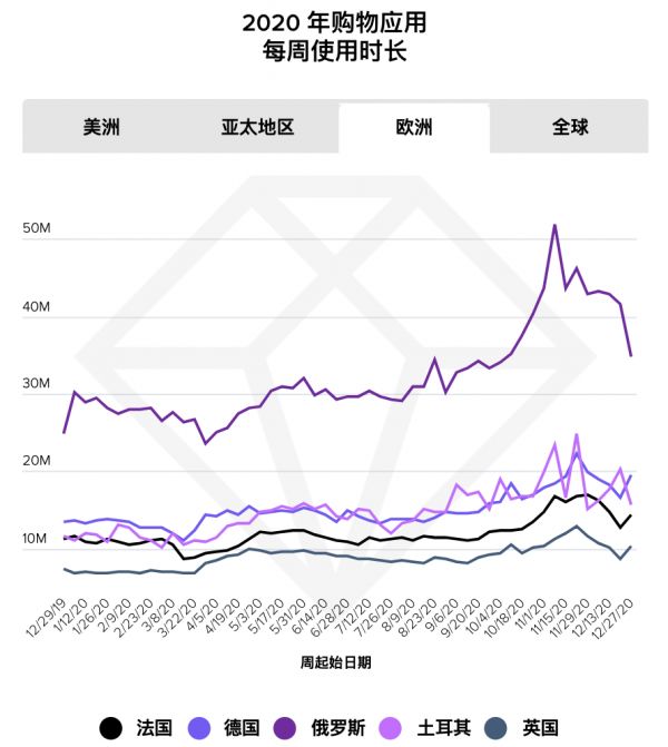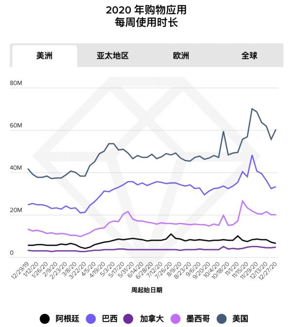 左右滑动查看 2020 年美洲、亚太地区、欧洲各国安卓手机用户在购物应用中每周使用时长变化趋势(点击放大查看原图)