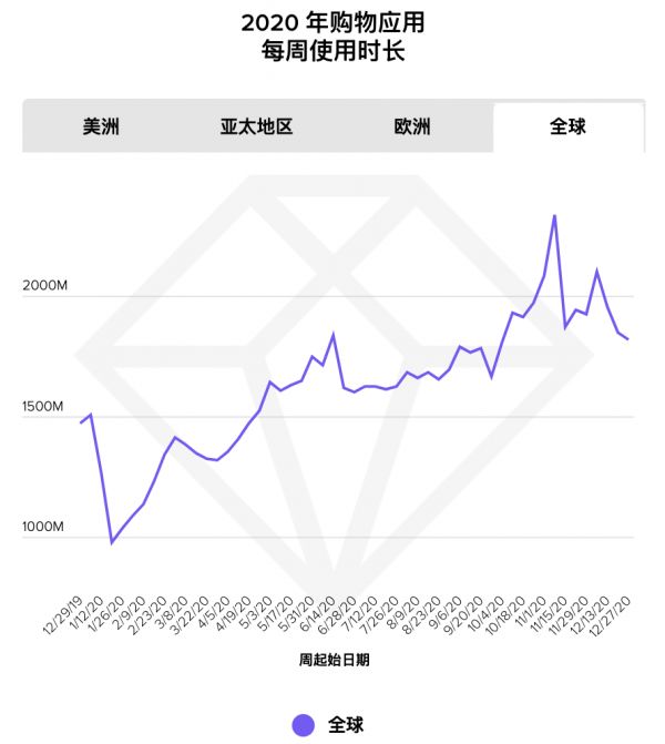 移动零售额最高的一周出现在 2020 年年末。11 月 8 日至 15 日期间,全球安卓手机用户在移动购物应用中花费的时长高达 23 亿小时,这段时间正是有名的双十一购物节期间。