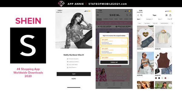 这种大规模转向智能手机购物的情况使零售应用跻身移动市场年度赢家。SHEIN就是一个典型例子。中国的电子时装品牌在 2020 年扩大了其全球运营规模。在《2021 年移动市场报告》中,我们可以清晰地窥见其卓著的成绩:在此应用上,墨西哥用户的使用时长增长了 170%,澳大利亚为 440%,英国为 490%,法国为 530%,加拿大为 550%,巴西为 5525%。2020 年,该公司的销售额更是有望达到 100 亿美元。