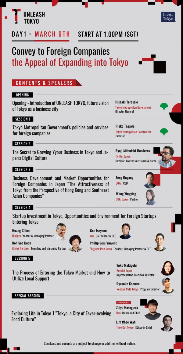 UNLEASH TOKYO 活动将在这一天达到高潮,Sony Innovation Fund Chief Investment Manager Gen Tsuchikawa 将讲述他的团队如何发掘并培育技术领先且能够与索尼形成联动的初创企业。当天,活动嘉宾还将讨论东京的多样性、大企业对创业企业的扶持等话题。来自三菱日联集团的嘉宾将介绍集团的投资策略,来自 KDDI 的嘉宾将分享 CVC(Corporate Venture Capital,企业创投)方面的经验。最后,东京都政府政策研究室国家战略特区项目高级主管 Masafumi Yonazu 将发表落幕演讲。