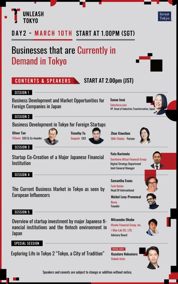 第二天的活动将由 Salesforce VP, Head of Industries Transformation,Japan Sanae Imai 开启,她将重点分享如何在东京寻找属于自己的生意机会。随后,来自创业企业 ViSenze 和 Snapask 的嘉宾将以圆桌形式探讨海外初创企业如何在东京发展。Mizuho Financial 集团和 Sumitomo Mitsui Financial 集团的嘉宾将从欧美投资者的视角分析新冠疫情对经济的影响、东京的商业环境、以及日本金融机构投资初创企业的思路。