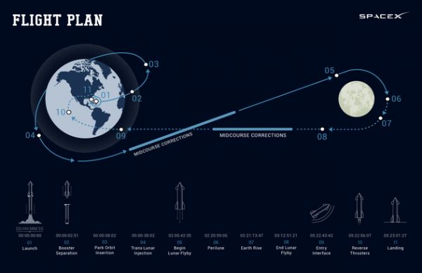 根据实际情况,以上所有时间点有可能会发生变化。但一旦选出整个团队,2022年和2023年将进行集中训练,为飞行做准备。现在他有一个粗略的飞行计划,可以在下图中看到,其中包括时间点和一个计划路线效果图,显示出飞行确实将环绕月球,然后返回。