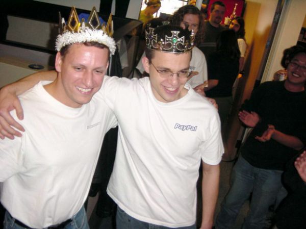 2002年2月15日,PayPal在纳斯达克上市,Max和Peter Thiel带着皇冠在办公室庆祝。图片来源于Max的个人博客:http://www.levchin.com/