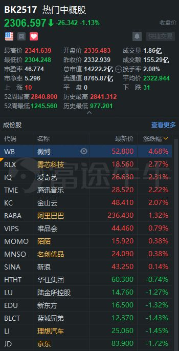 知名中概股中:微博涨4.68%;雾芯科技涨2.77%;腾讯音乐涨2.22%;阿里巴巴涨1.32%;贝壳跌9.27%;蔚来跌6.99%;拼多多跌5.11%。