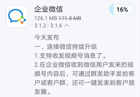 这次改版后,企业微信不仅能接收视频号消息,还可以把视频号内容分享出去。