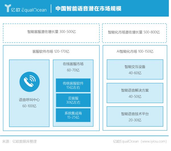 智能语音市场增量来源主要有:智能客服增长量,智能化市场增长量。智能客服软件市场现阶段的市场规模在120亿-170亿左右,但毛利较小。以现阶段产业规模测算,仍有300亿-500亿的潜在增长空间。智能化市场因需与行业深度结合,在应用初期难以获得理想的客单价及客单量。但随着技术的成熟,以及行业的深度开发,智能化市场拥有巨大的潜在增长空间(约500亿-800亿),并将从交互设备、解决方案、技术平台三个方向落地。