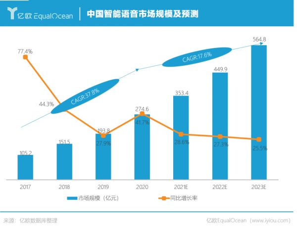 亿欧智库认为中国智能语音市场在未来几年仍处于上升趋势,预计2023年智能语音市场规模将达到564.8亿元,同比增长率虽有所下降但趋于平稳。语音市场仍具有较大发展空间。