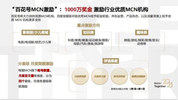 具体细则为:每月根据MCN旗下帐号数量及月度发文量等维度,分成四个星级给予对应的现金激励,一星级至四星级激励金额依次递增,分别为1000元/月、5000元/月、10000元/月与20000元/月四档。每期活动开始前一周,百花号会公布激励名额,活动结束后为上榜MCN定制专属榜单。