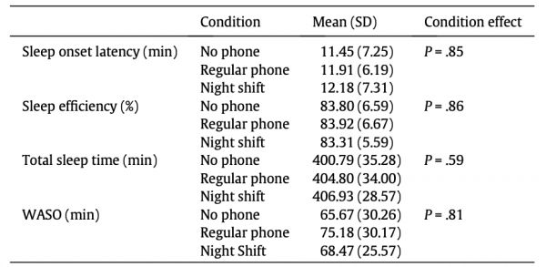 研究人员发现,对于那些总睡眠时间低于中间值的人,实验条件未对他们的睡眠指标产生明显的影响;而对于那些总睡眠时间高于中间值受试者,无手机组与使用手机组相比,睡眠质量显著高,WASO 概数值显著降低。