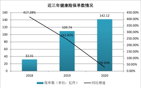 截至2020年12月31日,水滴公司已与62家保险公司合作,提供200种健康和人寿保险产品。奇偶派注意到,根据银保监会官网披露数据显示,2018年、2019年、2020年三年,健康险保单数分别为32.01亿件、109.74亿件、142.12亿件,三年来,健康险保单数的增速大幅下降,分别为417.28%、242.83%、29.50%。