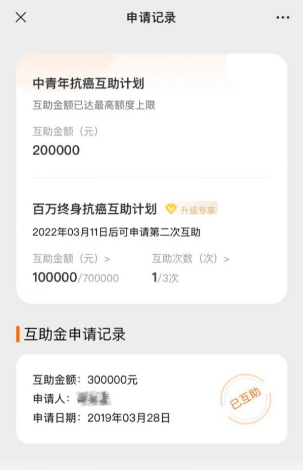 赵军全家都是水滴互助的升级会员,他告诉奇偶派,当时加入水滴互助会员,水滴互助承诺“给予3次互助”,2019年3月,父亲患癌,申请了一次互助,获得了30万的互助金额,“这个我们很感谢水滴。”但让他感到突然又不解的是,今年3月底,水滴互助骤然关停,这意味着,剩下两次互助就“没法得到了”。