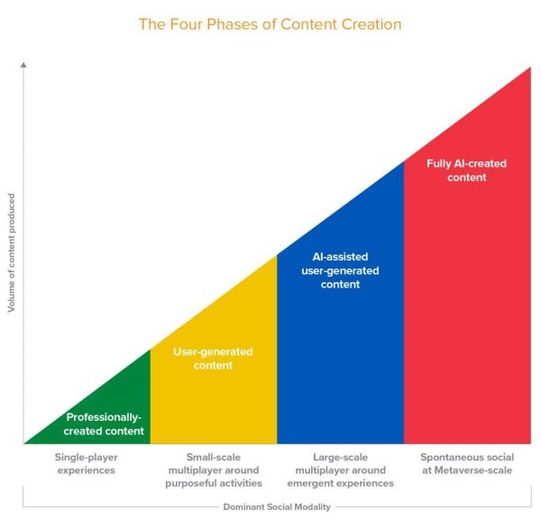 由一小部分人类创作者去创作UGC,尽管这相对于专业创作的工作室内容中已经是迈出了有意义的一步,但这很可能只是构建虚拟世界及其新的社会系统所需的一方面。